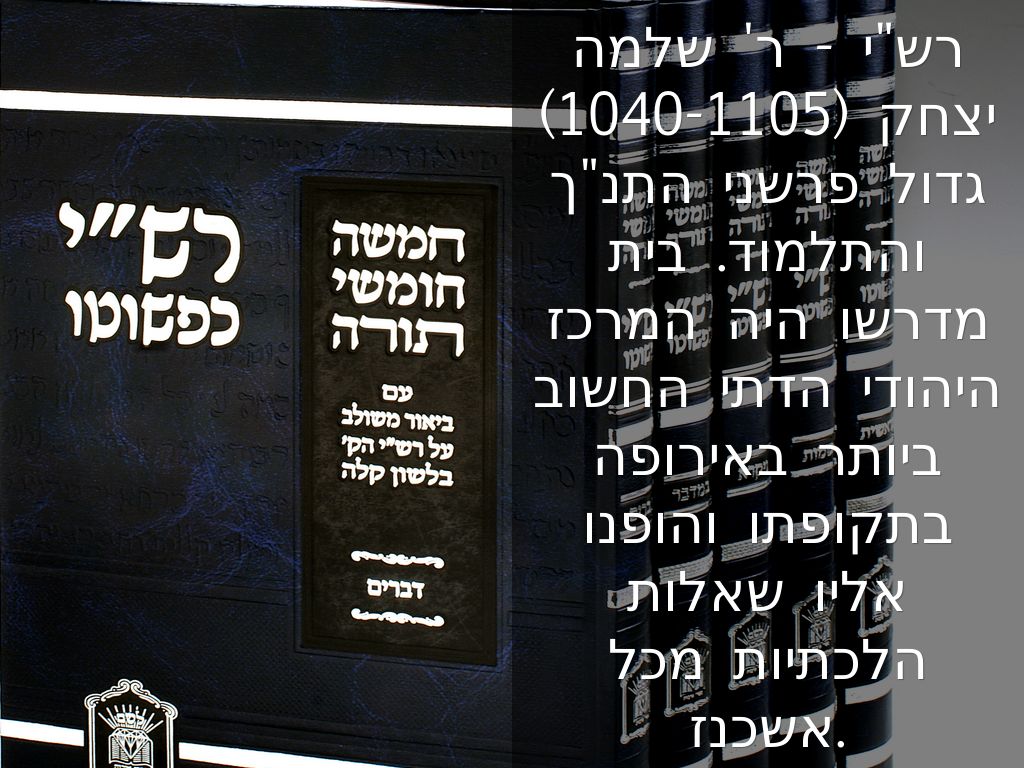 רש"י - ר' שלמה יצחק (1040-1105) גדול פרשני התנ"ך והתלמוד. בית מדרשו היה המרכז היהודי הדתי החשוב ביותר באירופה בתקופתו והופנו אליו שאלות הלכתיות מכל אשכנז.
