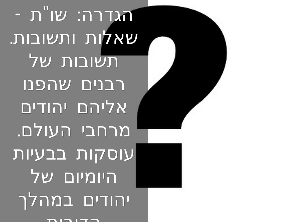 הגדרה: שו"ת - שאלות ותשובות. תשובות של רבנים שהפנו אליהם יהודים מרחבי העולם. עוסקות בבעיות היומיום של יהודים במהלך הדורות