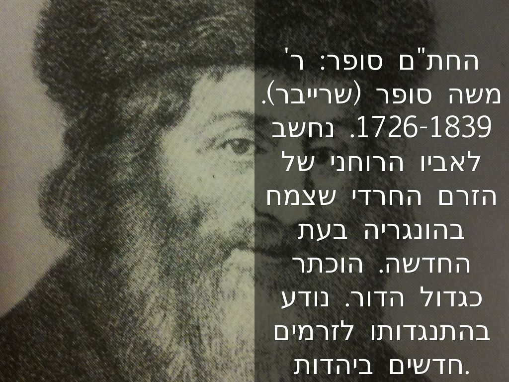 החת"ם סופר: ר' משה סופר (שרייבר). 1726-1839. נחשב לאביו הרוחני של הזרם החרדי שצמח בהונגריה בעת החדשה. הוכתר כגדול הדור. נודע בהתנגדותו לזרמים חדשים ביהדות.