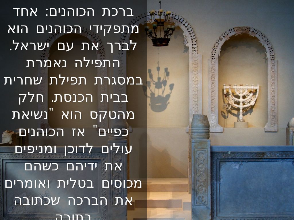 ברכת הכוהנים: אחד מתפקידי הכוהנים הוא לברך את עם ישראל. התפילה נאמרת במסגרת תפילת שחרית בבית הכנסת. חלק מהטקס הוא "נשיאת כפיים" אז הכוהנים עולים לדוכן ומניפים את ידיהם כשהם מכוסים בטלית ואומרים את הברכה שכתובה בתורה