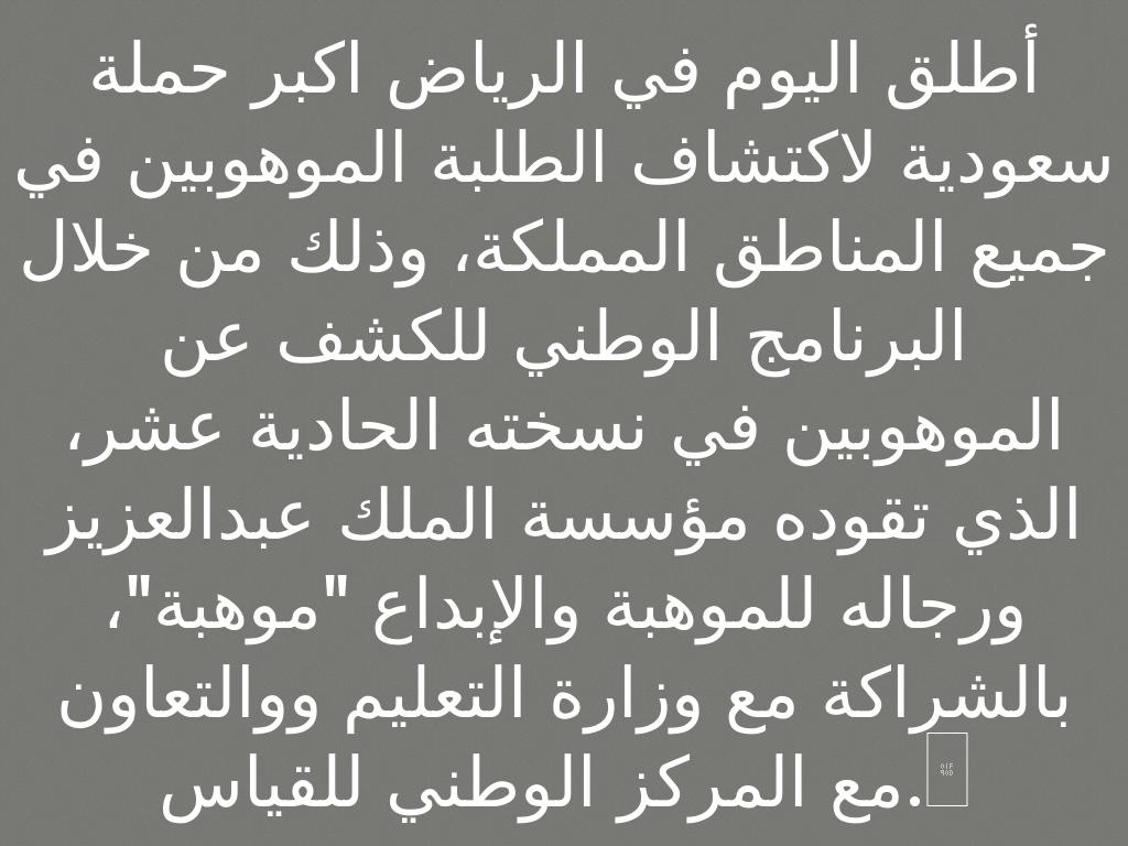 أطلق اليوم في الرياض اكبر حملة سعودية لاكتشاف الطلبة الموهوبين في جميع المناطق المملكة، وذلك من خلال البرنامج الوطني للكشف عن الموهوبين في نسخته الحادية عشر، الذي تقوده مؤسسة الملك عبدالعزيز ورجاله للموهبة والإبداع "موهبة"، بالشراكة مع وزارة التعليم ووالتعاون مع المركز الوطني للقياس.🤍