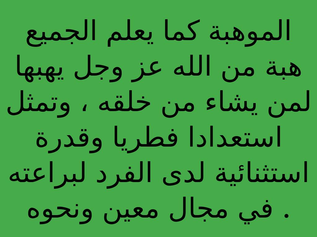 الموهبة كما يعلم الجميع هبة من الله عز وجل يهبها لمن يشاء من خلقه ، وتمثل استعدادا فطريا وقدرة استثنائية لدى الفرد لبراعته في مجال معين ونحوه .
