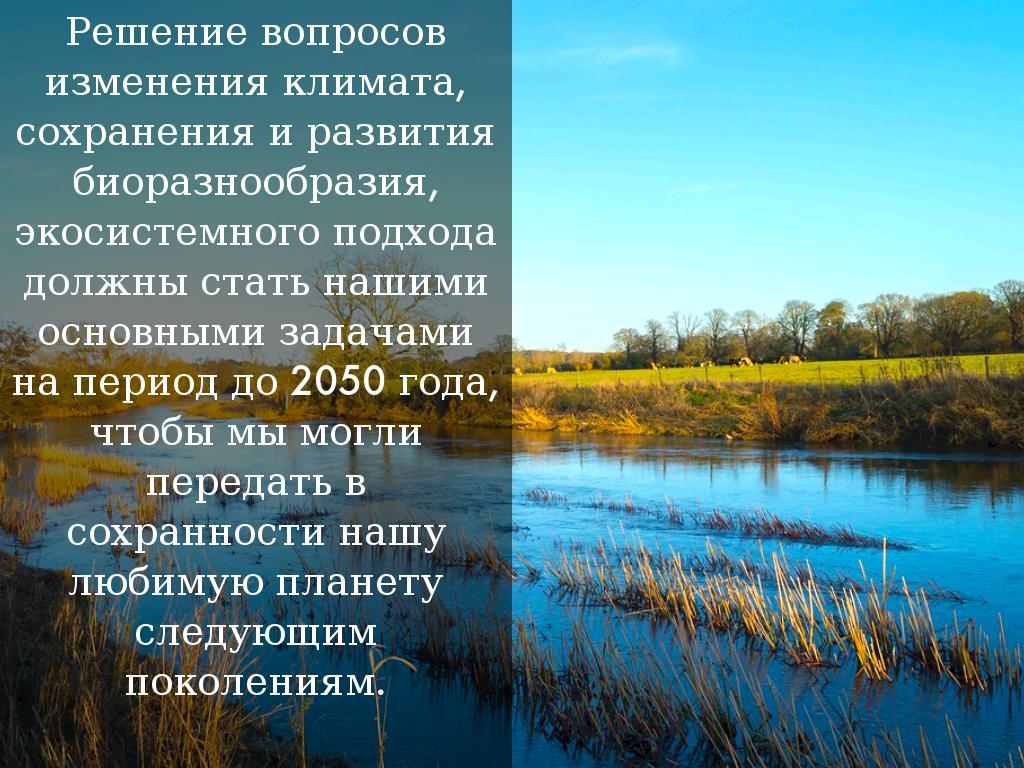 Решение вопросов изменения климата, сохранения и развития биоразнообразия, экосистемного подхода должны стать нашими основными задачами на период до 2050 года, чтобы мы могли передать в сохранности нашу любимую планету следующим поколениям.