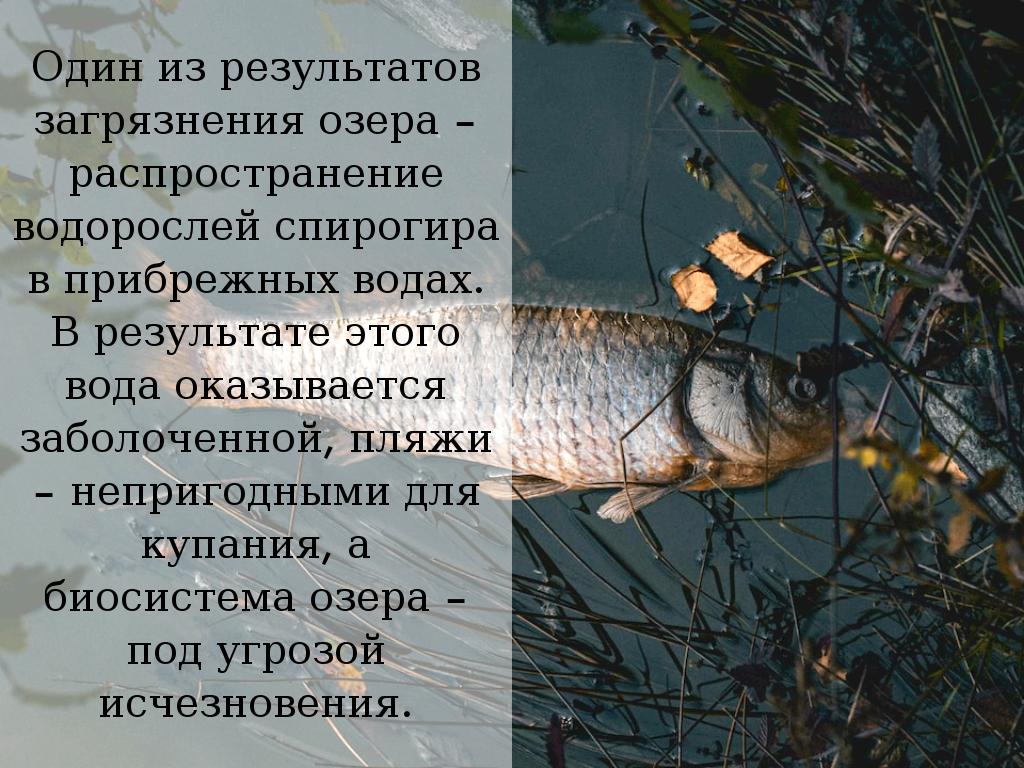 Один из результатов загрязнения озера – распространение водорослей спирогира в прибрежных водах. В результате этого вода оказывается заболоченной, пляжи – непригодными для купания, а биосистема озера – под угрозой исчезновения.