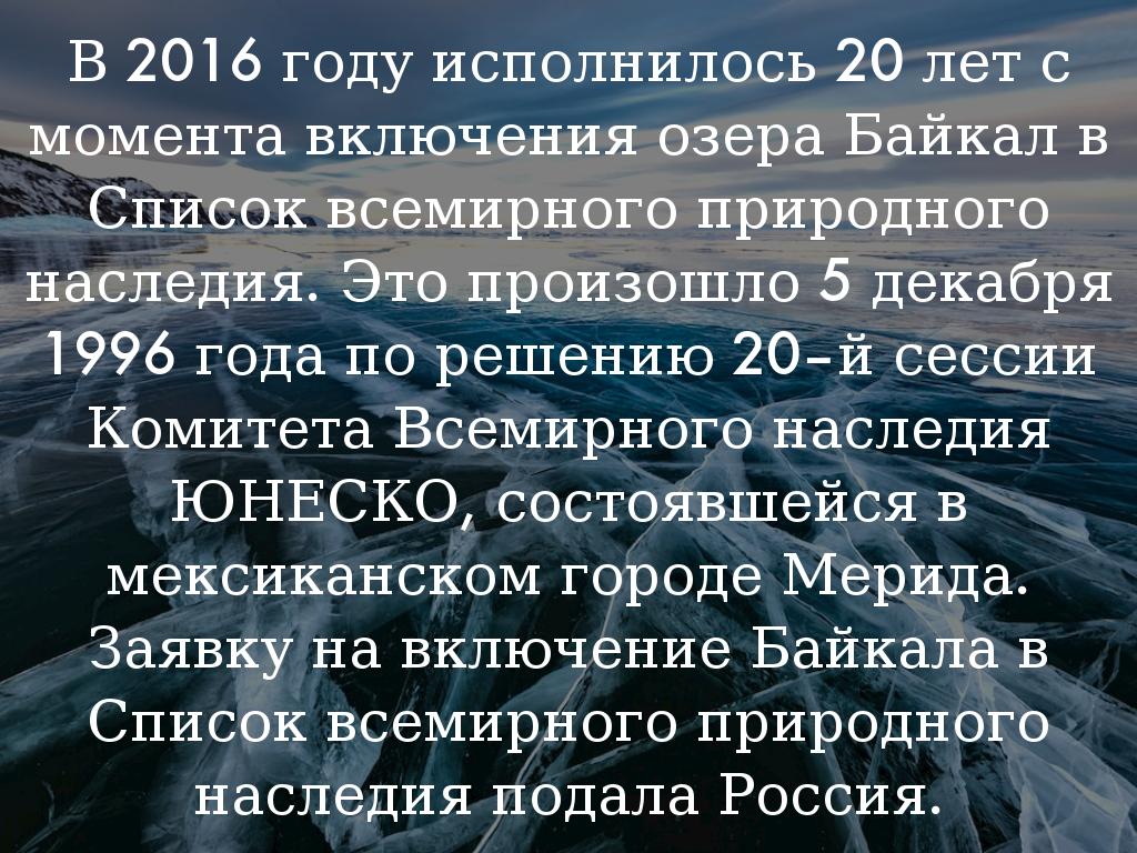 В 2016 году исполнилось 20 лет с момента включения озера Байкал в Список всемирного природного наследия. Это произошло 5 декабря 1996 года по решению 20–й сессии Комитета Всемирного наследия ЮНЕСКО, состоявшейся в мексиканском городе Мерида. Заявку на включение Байкала в Список всемирного природного наследия подала Россия.