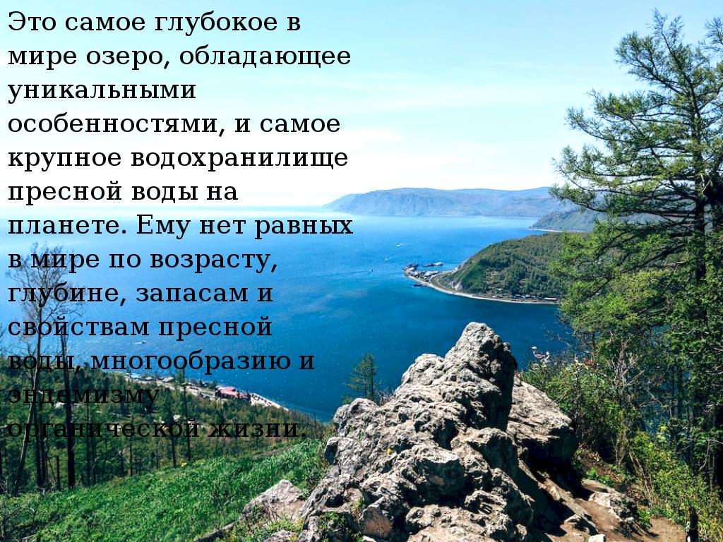 Это самое глубокое в мире озеро, обладающее уникальными особенностями, и самое крупное водохранилище пресной воды на планете. Ему нет равных в мире по возрасту, глубине, запасам и свойствам пресной воды, многообразию и эндемизму органической жизни.