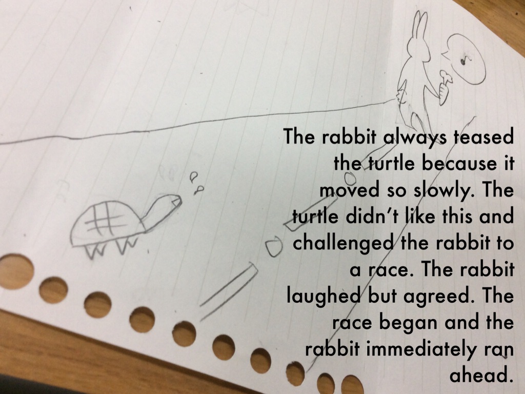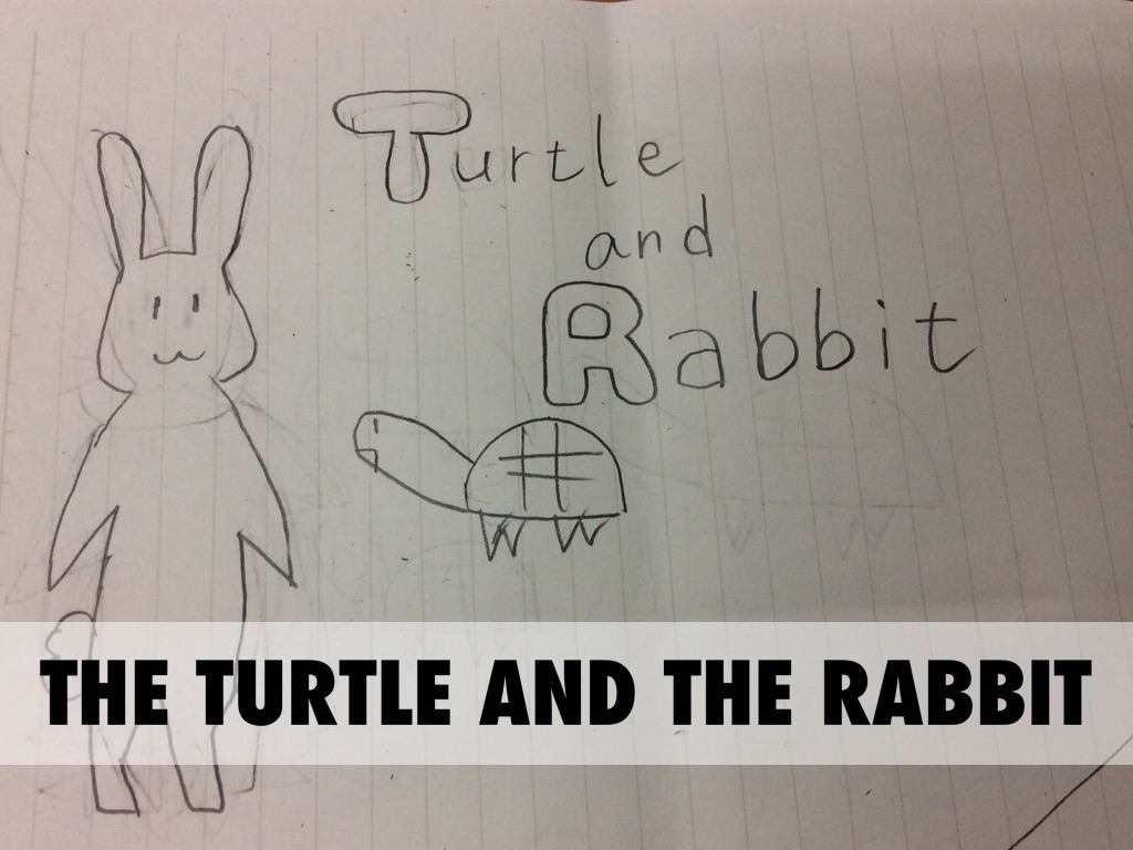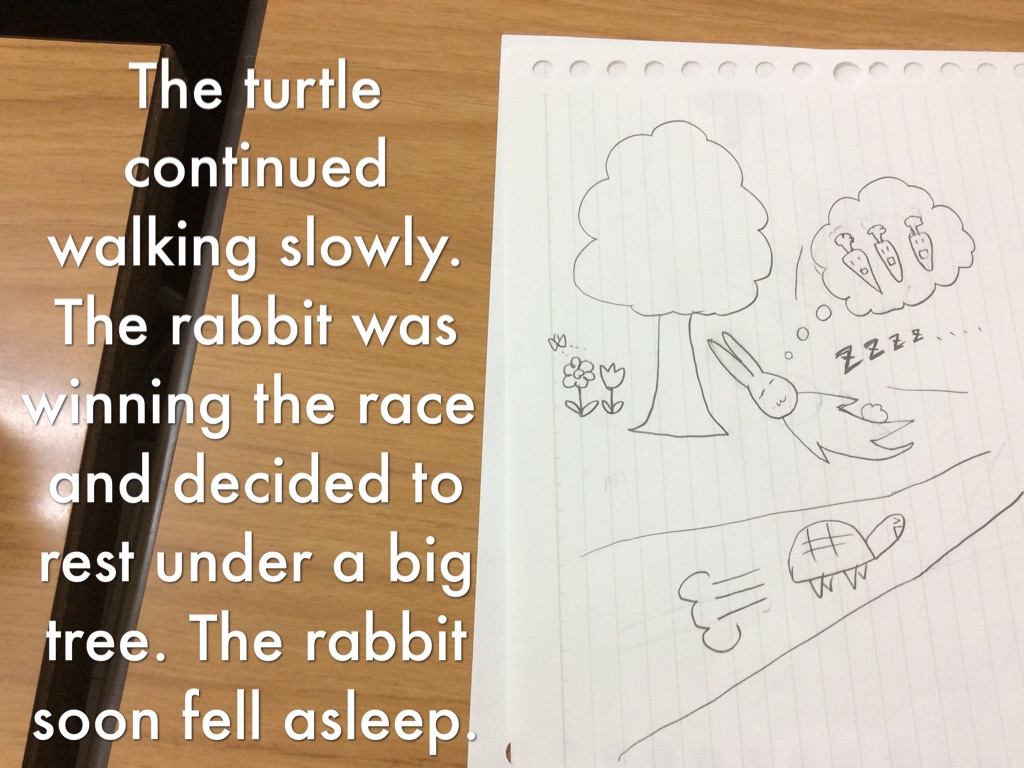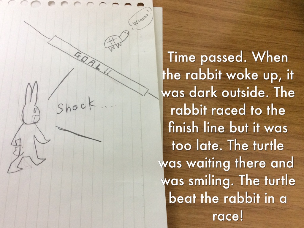 Time passed. When the rabbit woke up, it was dark outside. The rabbit raced to the finish line but it was too late. The turtle was waiting there and was smiling. The turtle beat the rabbit in a race!