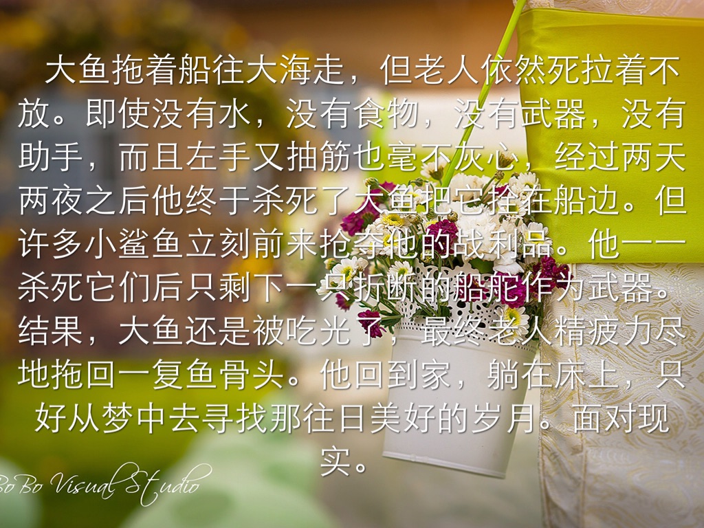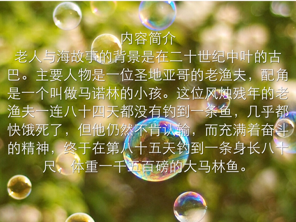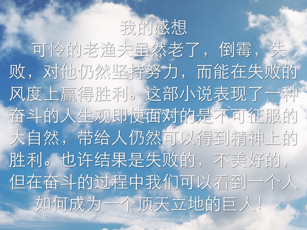 可怜的老渔夫虽然老了,倒霉,失败,对他仍然坚持努力,而能在失败的风度上赢得胜利。这部小说表现了一种奋斗的人生观即使面对的是不可征服的大自然,带给人仍然可以得到精神上的胜利。也许结果是失败的,不美好的,但在奋斗的过程中我们可以看到一个人如何成为一个顶天立地的巨人!