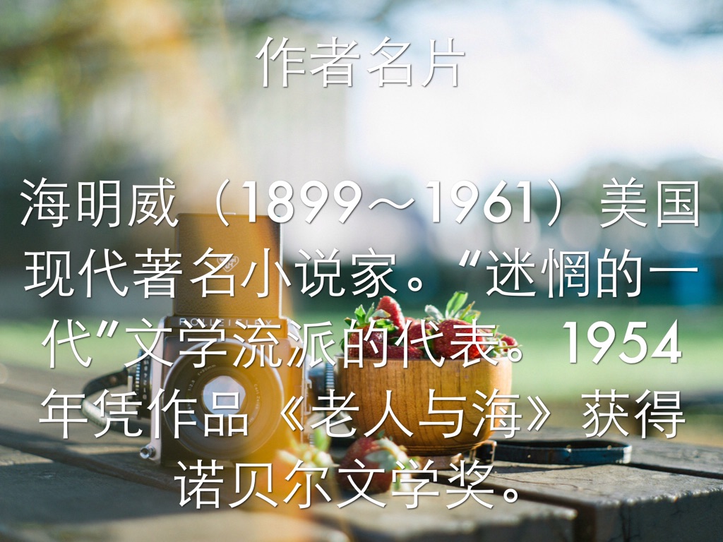 海明威(1899~1961)美国现代著名小说家。“迷惘的一代”文学流派的代表。1954年凭作品《老人与海》获得诺贝尔文学奖。