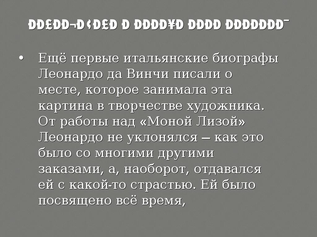 • Ещё первые итальянские биографы Леонардо да Винчи писали о месте, которое занимала эта картина в творчестве художника. От работы над «Моной Лизой» Леонардо не уклонялся — как это было со многими другими заказами, а, наоборот, отдавался ей с какой-то страстью. Ей было посвящено всё время, остававшееся у него от работы над «Битвой при Ангиари»[2]. Он потратил на него значительное время и, покидая Италию в зрелом возрасте, увёз с собой во Францию в числе