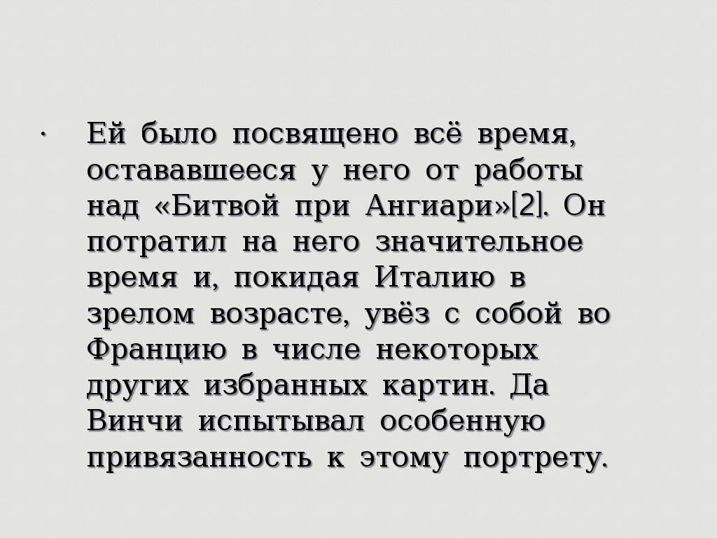 • Ей было посвящено всё время, остававшееся у него от работы над «Битвой при Ангиари»[2]. Он потратил на него значительное время и, покидая Италию в зрелом возрасте, увёз с собой во Францию в числе некоторых других избранных картин. Да Винчи испытывал особенную привязанность к этому портрету.