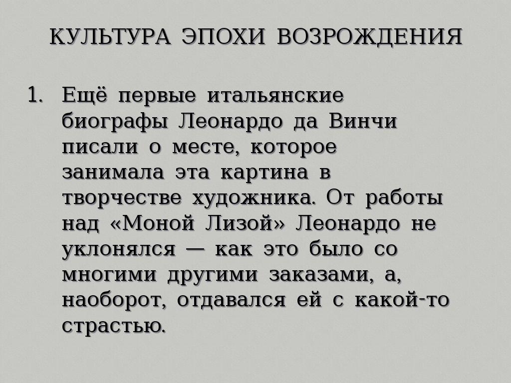 • Ещё первые итальянские биографы Леонардо да Винчи писали о месте, которое занимала эта картина в творчестве художника. От работы над «Моной Лизой» Леонардо не уклонялся — как это было со многими другими заказами, а, наоборот, отдавался ей с какой-то страстью.