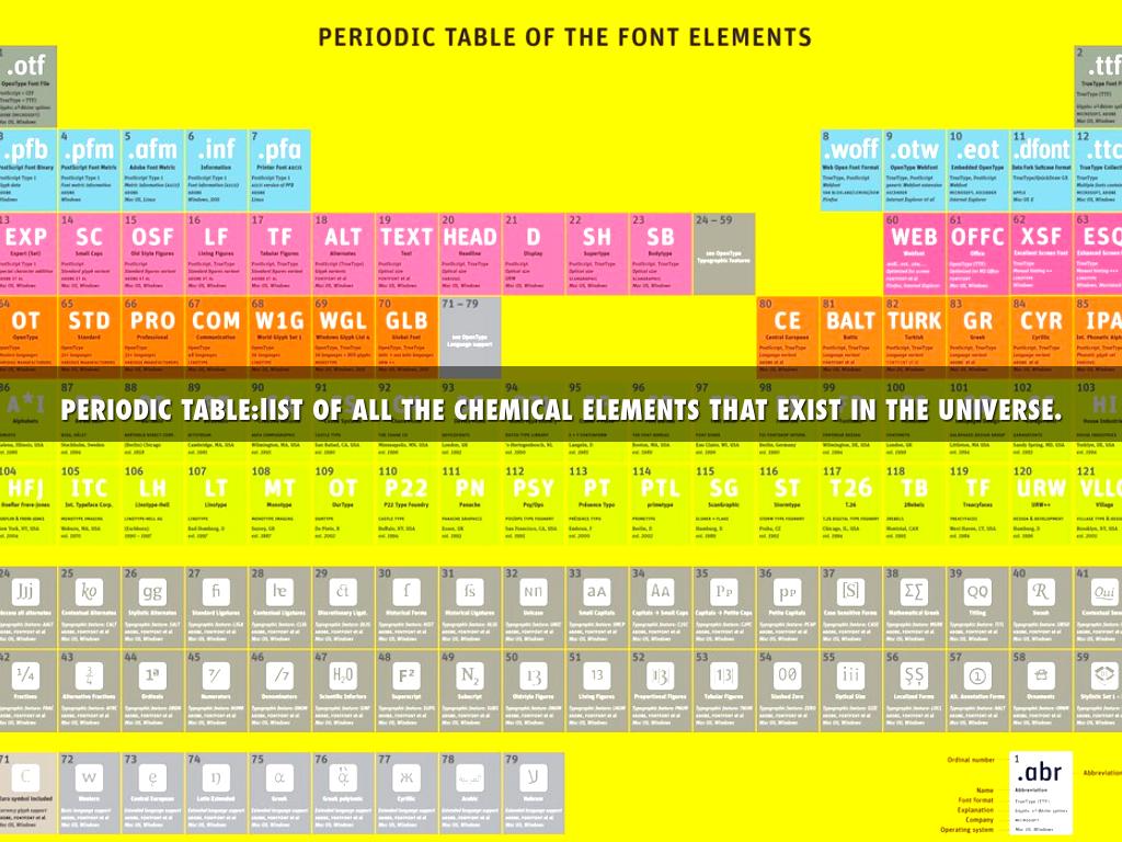 PERIODIC TABLE:lIST OF ALL THE CHEMICAL ELEMENTS THAT EXIST IN THE UNIVERSE.