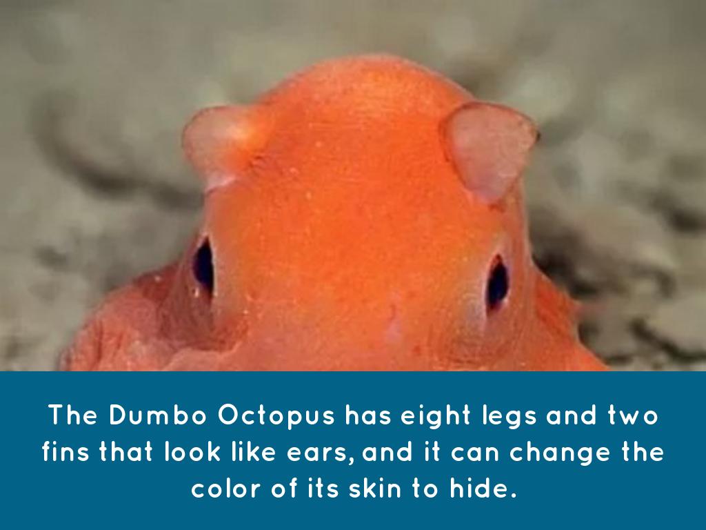 The Dumbo Octopus has eight legs and two fins that look like ears, and it can change the