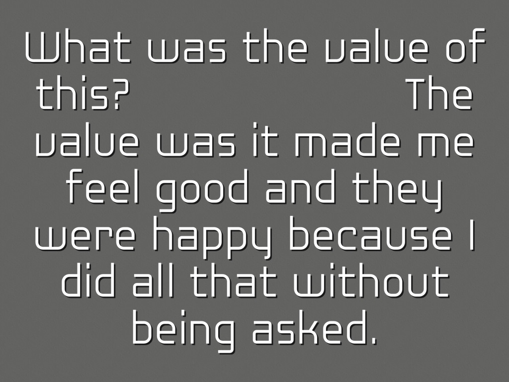 What was the value of this? The value was it made me feel good and they were happy because I did all that without being asked.