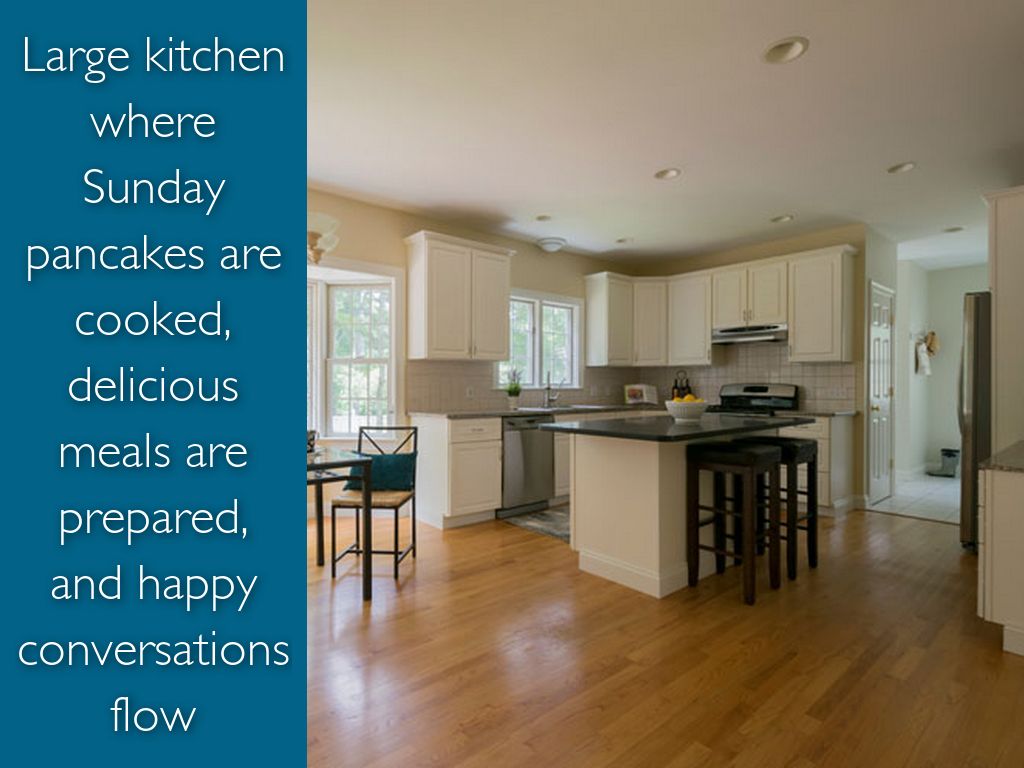 Large kitchen where Sunday pancakes are cooked, delicious meals are prepared, and happy conversations flow