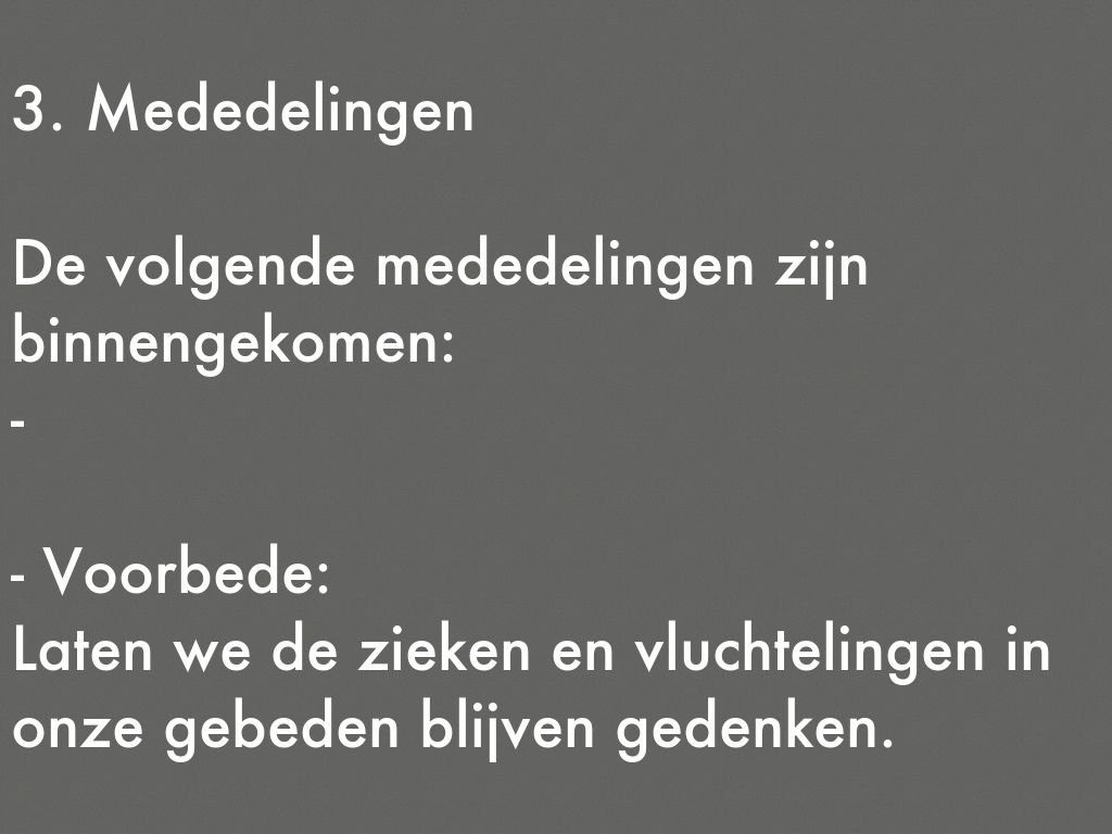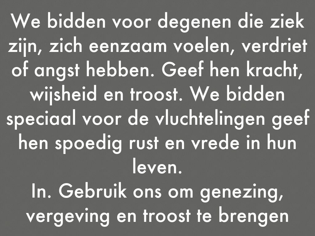 We bidden voor degenen die ziek zijn, zich eenzaam voelen, verdriet of angst hebben. Geef hen kracht, wijsheid en troost. We bidden speciaal voor de vluchtelingen geef hen spoedig rust en vrede in hun leven.