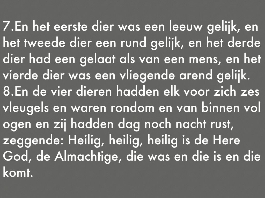 8.En de vier dieren hadden elk voor zich zes vleugels en waren rondom en van binnen vol ogen en zij hadden dag noch nacht rust, zeggende: Heilig, heilig, heilig is de Here God, de Almachtige, die was en die is en die komt.