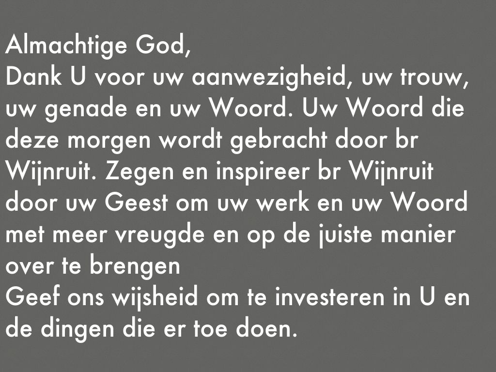 Dank U voor uw aanwezigheid, uw trouw, uw genade en uw Woord. Uw Woord die deze morgen wordt gebracht door br Wijnruit. Zegen en inspireer br Wijnruit door uw Geest om uw werk en uw Woord met meer vreugde en op de juiste manier over te brengen