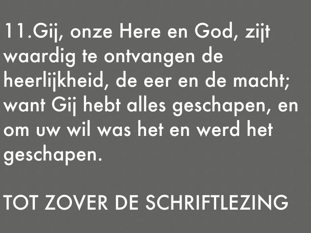11.Gij, onze Here en God, zijt waardig te ontvangen de heerlijkheid, de eer en de macht; want Gij hebt alles geschapen, en om uw wil was het en werd het geschapen.