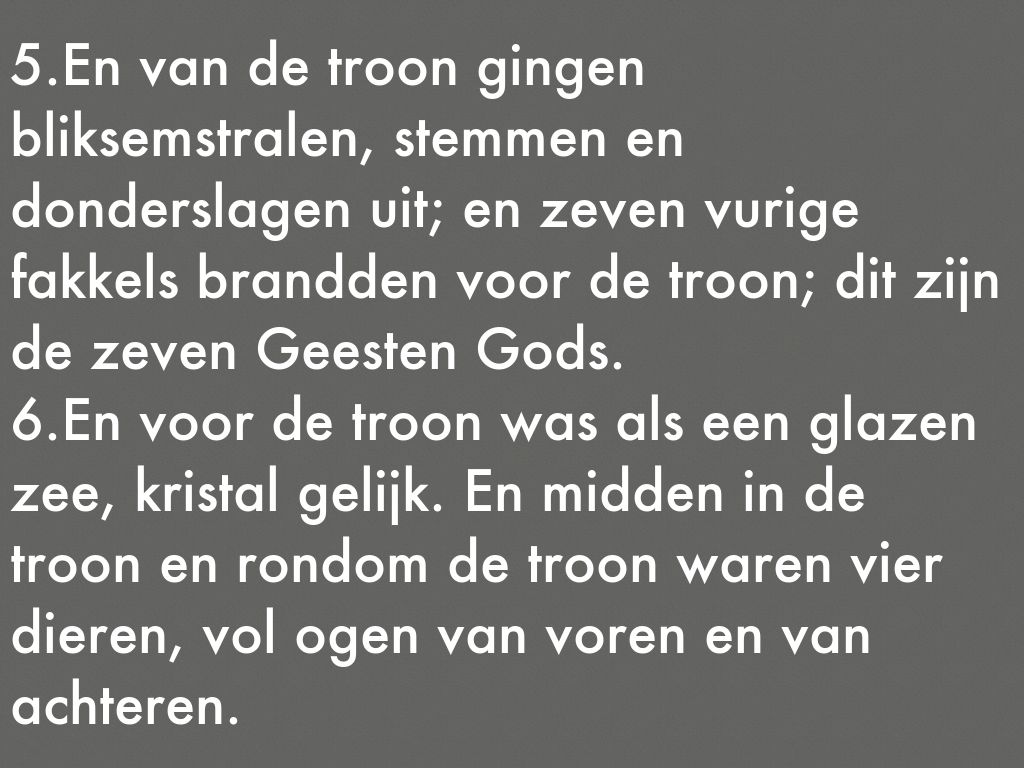 5.En van de troon gingen bliksemstralen, stemmen en donderslagen uit; en zeven vurige fakkels brandden voor de troon; dit zijn de zeven Geesten Gods.