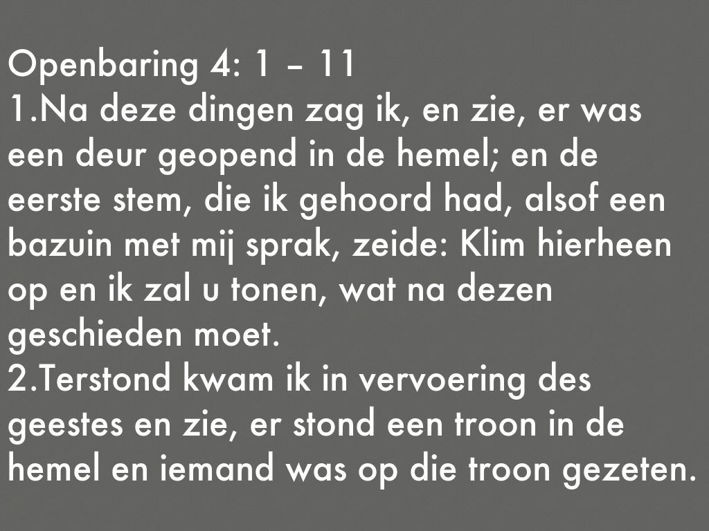 1.Na deze dingen zag ik, en zie, er was een deur geopend in de hemel; en de eerste stem, die ik gehoord had, alsof een bazuin met mij sprak, zeide: Klim hierheen op en ik zal u tonen, wat na dezen geschieden moet.