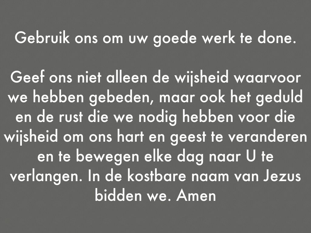 Geef ons niet alleen de wijsheid waarvoor we hebben gebeden, maar ook het geduld en de rust die we nodig hebben voor die wijsheid om ons hart en geest te veranderen en te bewegen elke dag naar U te verlangen. In de kostbare naam van Jezus bidden we. Amen