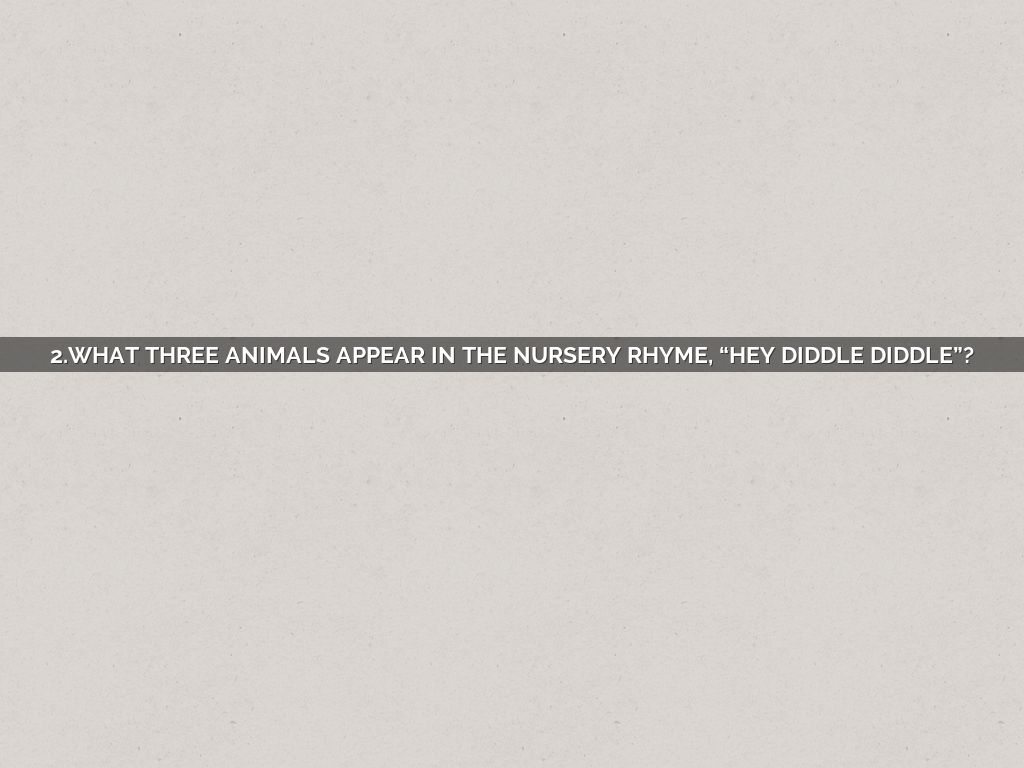 2.What three animals appear in the nursery rhyme, “Hey Diddle Diddle”?