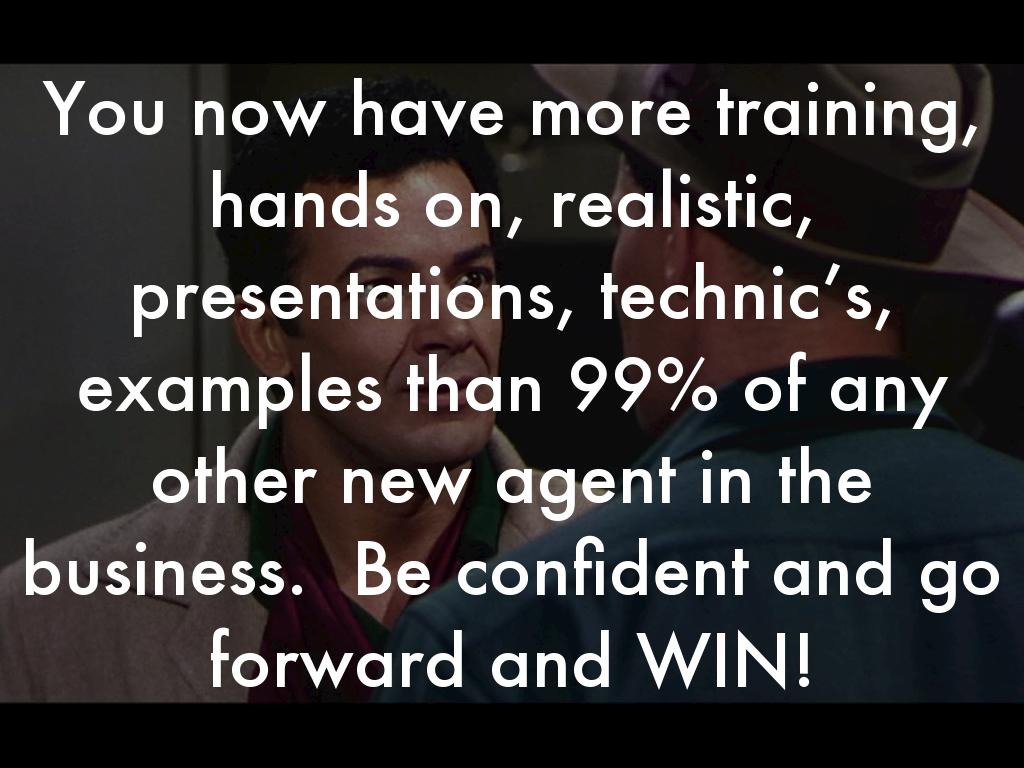 You now have more training, hands on, realistic, presentations, technic’s, examples than 99% of any other new agent in the business. Be confident and go forward and WIN!