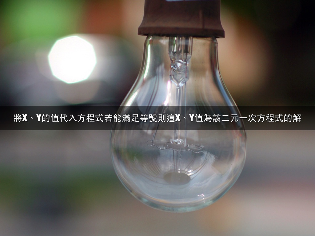將X、Y的值代入方程式若能滿足等號則這X、Y值為該二元一次方程式的解