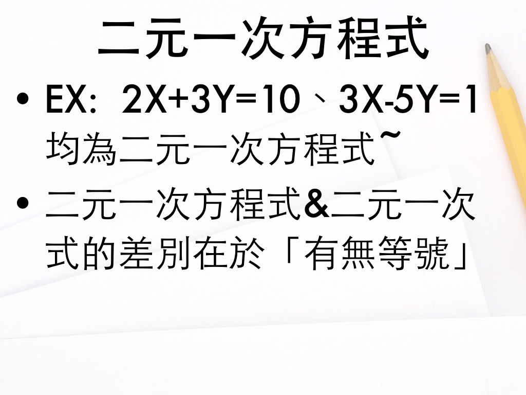 EX: 2X+3Y=10、3X-5Y=1均為二元一次方程式~