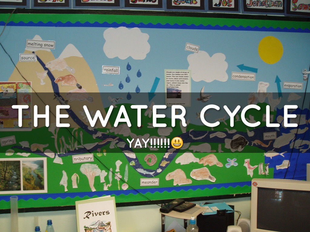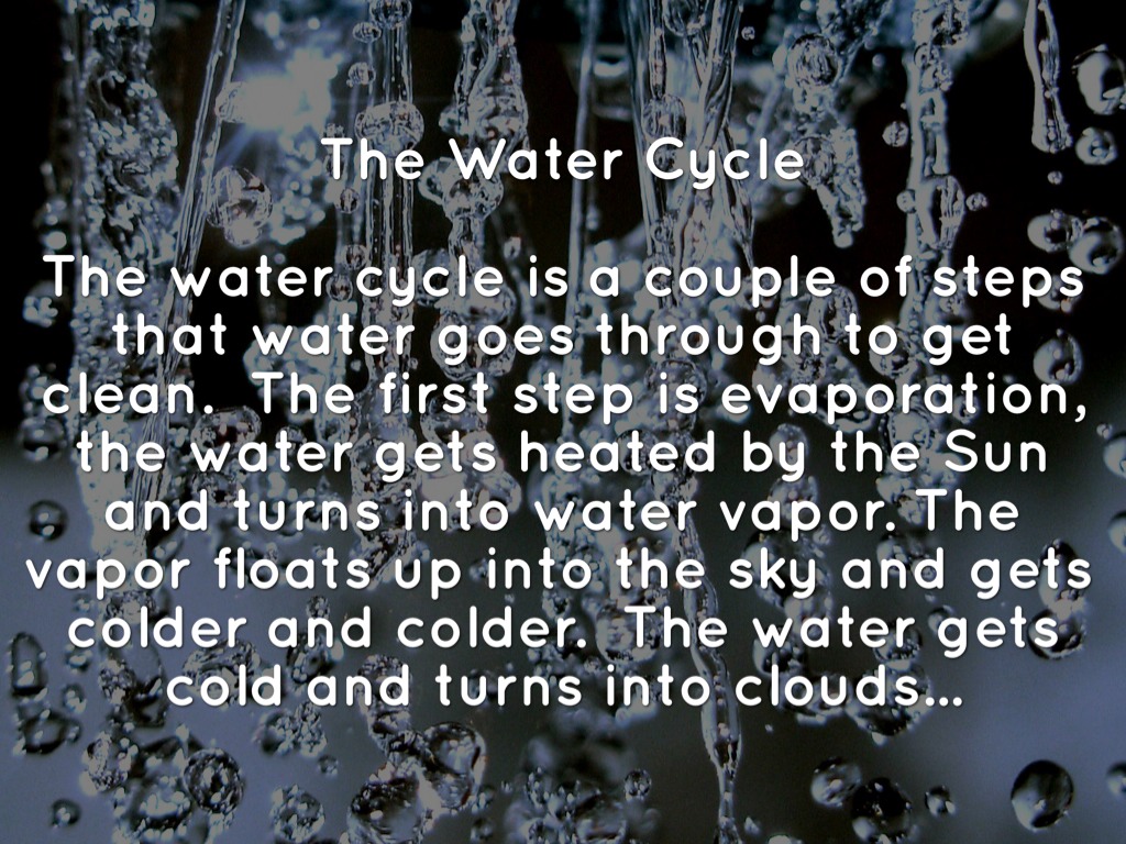 The water cycle is a couple of steps that water goes through to get clean. The first step is evaporation, the water gets heated by the Sun and turns into water vapor. The vapor floats up into the sky and gets colder and colder. The water gets cold and turns into clouds...