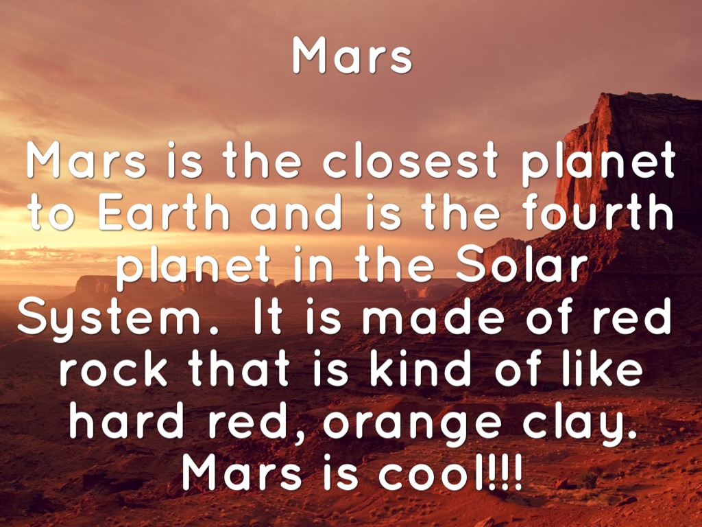 Mars is the closest planet to Earth and is the fourth planet in the Solar System. It is made of red rock that is kind of like hard red, orange clay. Mars is cool!!!