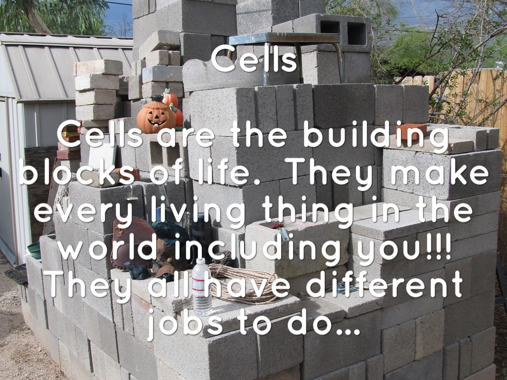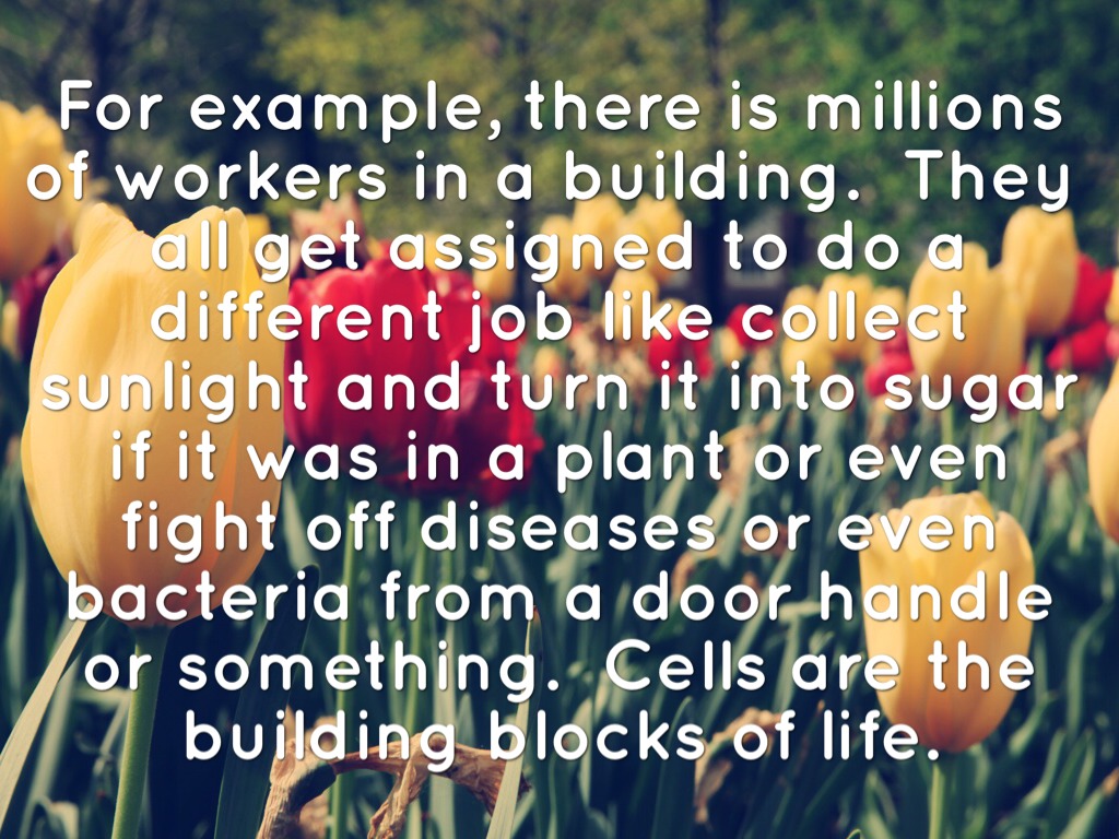 For example, there is millions of workers in a building. They all get assigned to do a different job like collect sunlight and turn it into sugar if it was in a plant or even fight off diseases or even bacteria from a door handle or something. Cells are the building blocks of life.