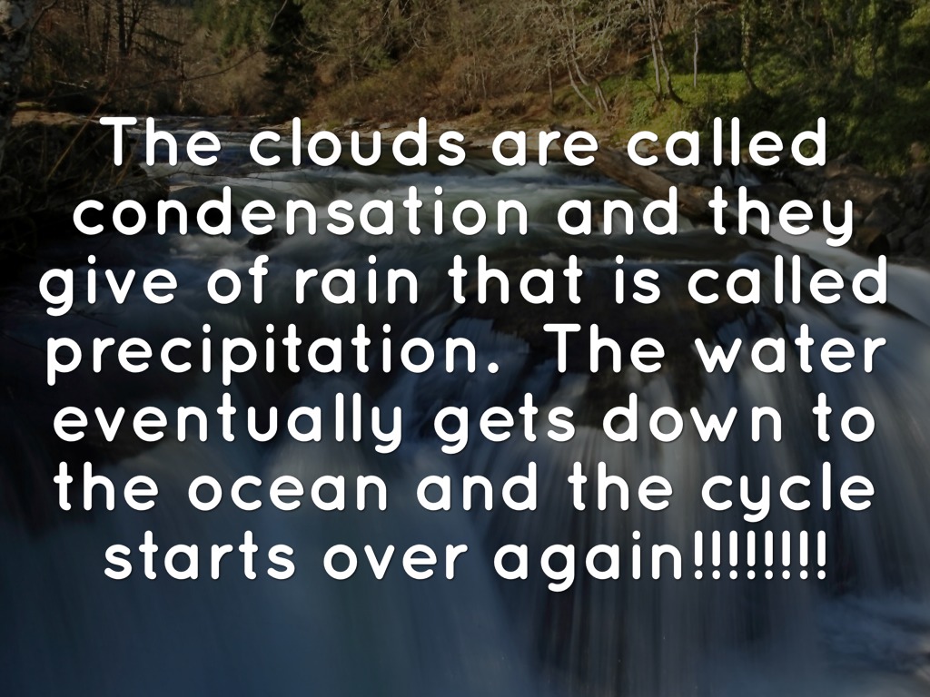 The clouds are called condensation and they give of rain that is called precipitation. The water eventually gets down to the ocean and the cycle starts over again!!!!!!!!