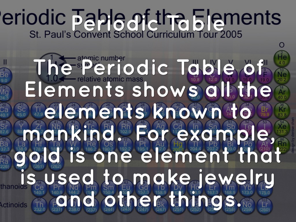 The Periodic Table of Elements shows all the elements known to mankind. For example, gold is one element that is used to make jewelry and other things.