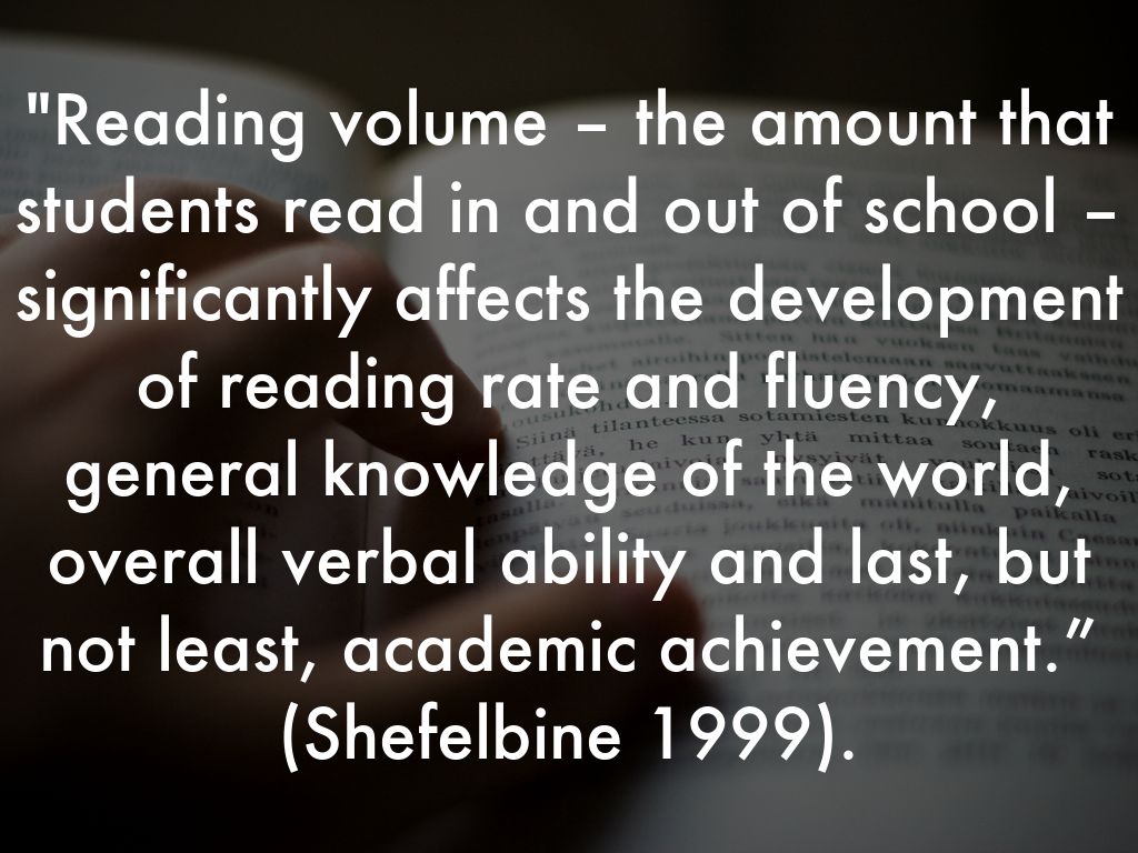 "Reading volume – the amount that students read in and out of school – significantly affects the development of reading rate and fluency, general knowledge of the world, overall verbal ability and last, but not least, academic achievement.” (Shefelbine 1999).