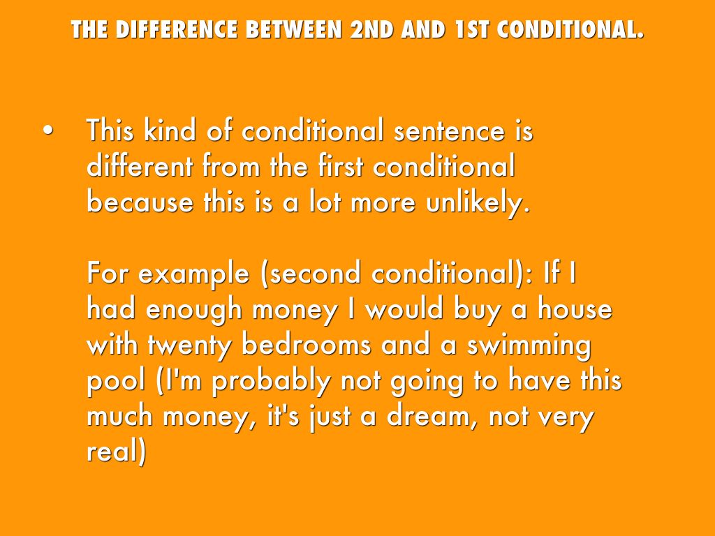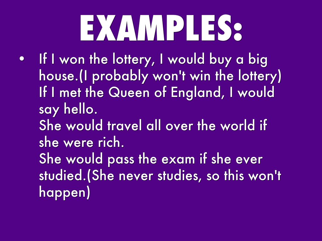 For example (second conditional): If I had enough money I would buy a house with twenty bedrooms and a swimming pool (I'm probably not going to have this much money, it's just a dream, not very real)