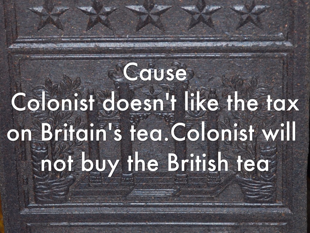 Colonist doesn't like the tax on Britain's tea.Colonist will not buy the British tea