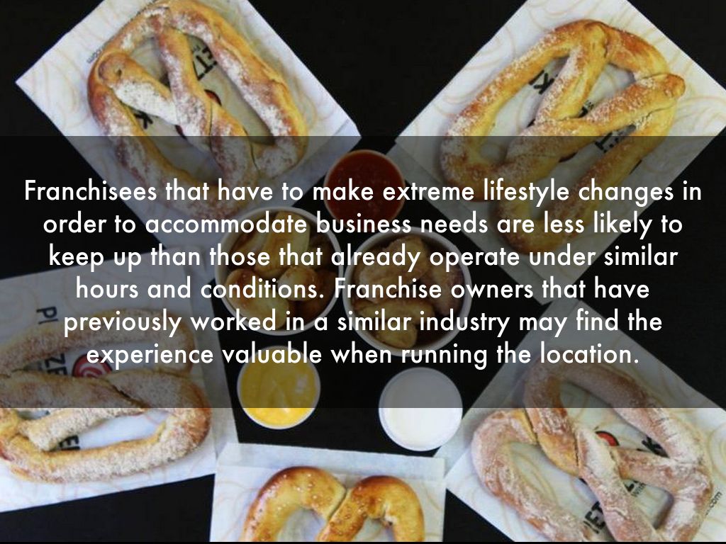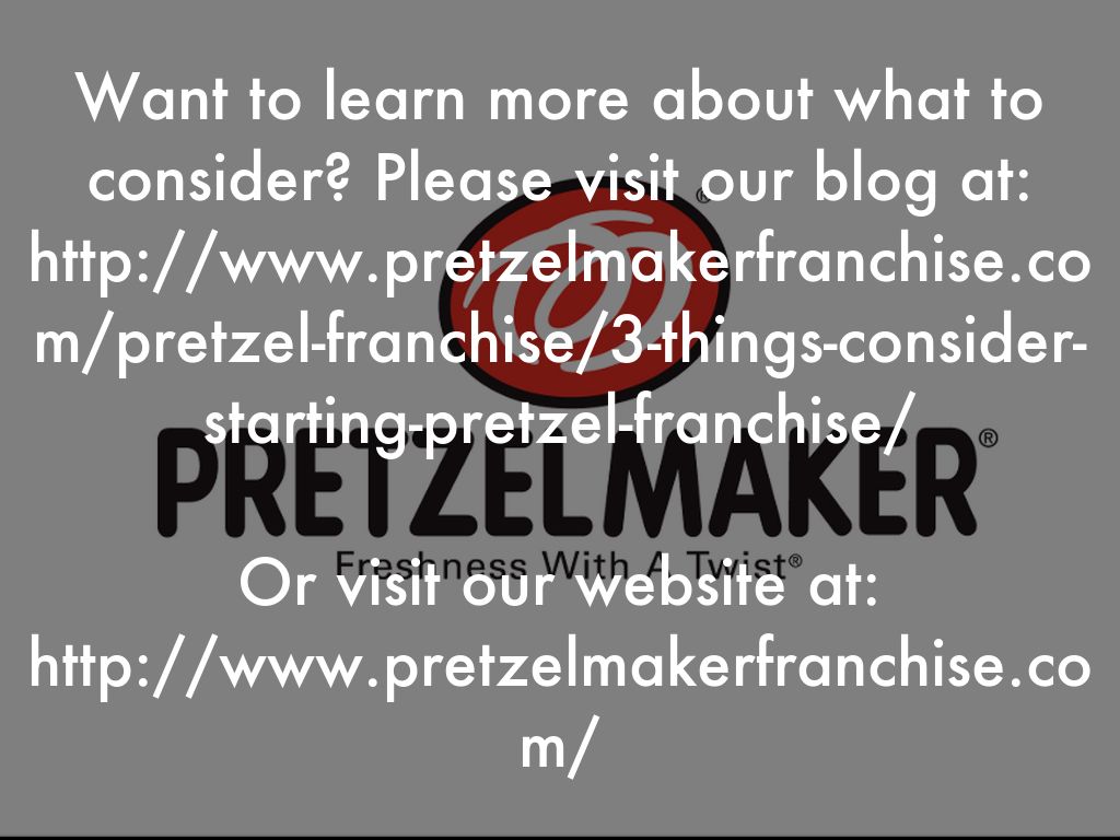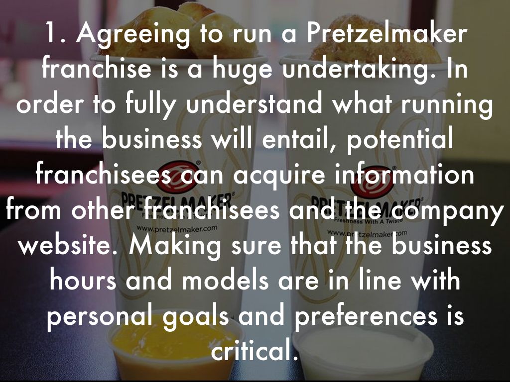 1. Agreeing to run a Pretzelmaker franchise is a huge undertaking. In order to fully understand what running the business will entail, potential franchisees can acquire information from other franchisees and the company website. Making sure that the business hours and models are in line with personal goals and preferences is critical.