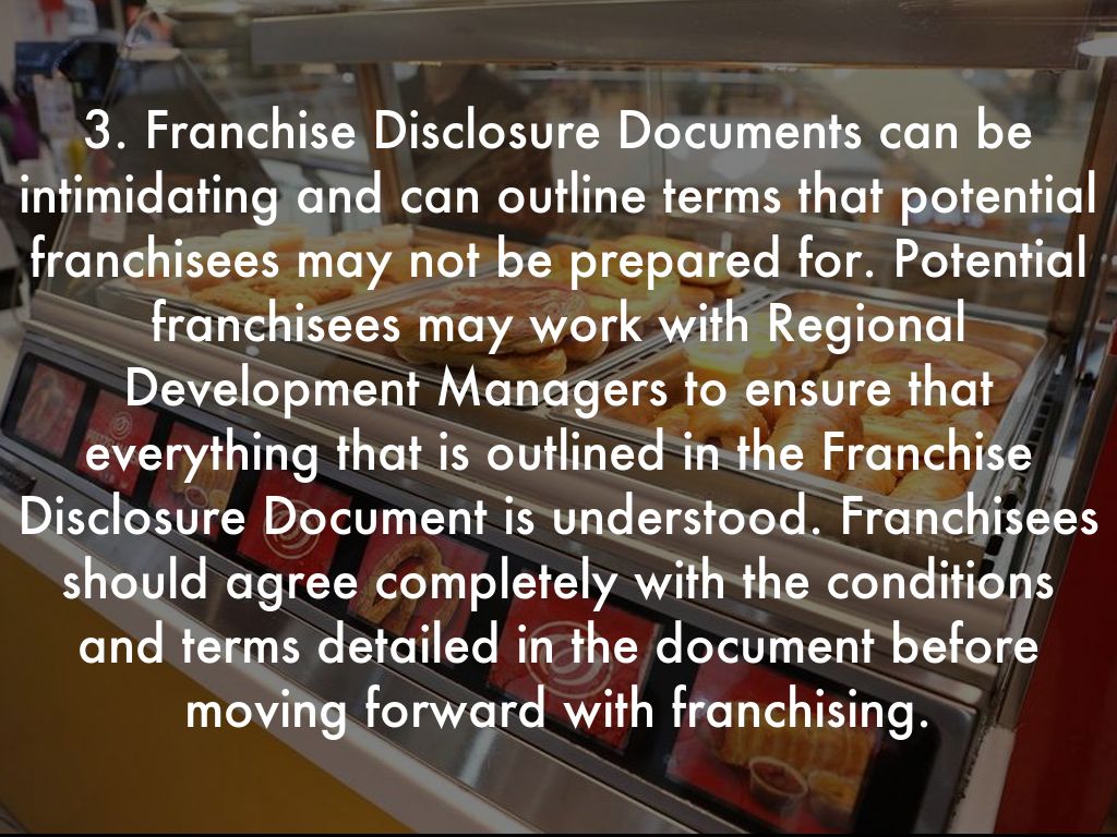 3. Franchise Disclosure Documents can be intimidating and can outline terms that potential franchisees may not be prepared for. Potential franchisees may work with Regional Development Managers to ensure that everything that is outlined in the Franchise Disclosure Document is understood. Franchisees should agree completely with the conditions and terms detailed in the document before moving forward with franchising.