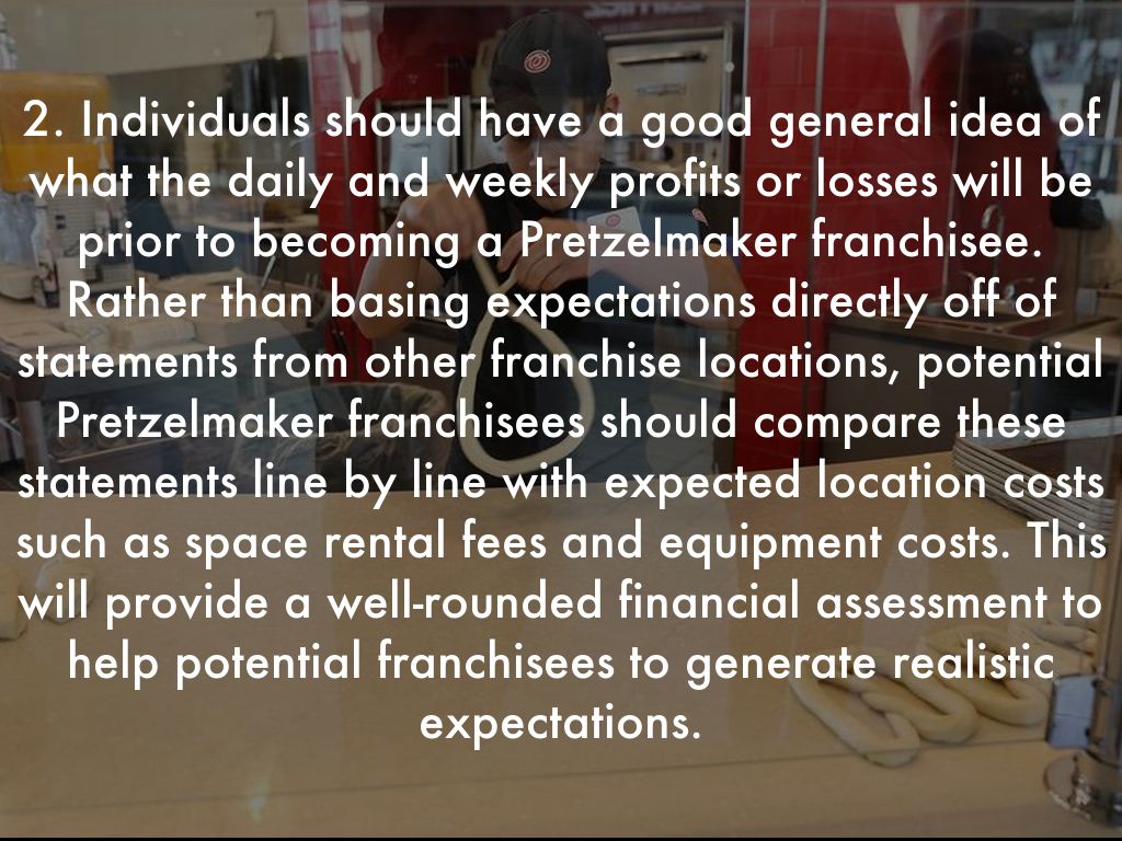 2. Individuals should have a good general idea of what the daily and weekly profits or losses will be prior to becoming a Pretzelmaker franchisee. Rather than basing expectations directly off of statements from other franchise locations, potential Pretzelmaker franchisees should compare these statements line by line with expected location costs such as space rental fees and equipment costs. This will provide a well-rounded financial assessment to help potential franchisees to generate realistic expectations.