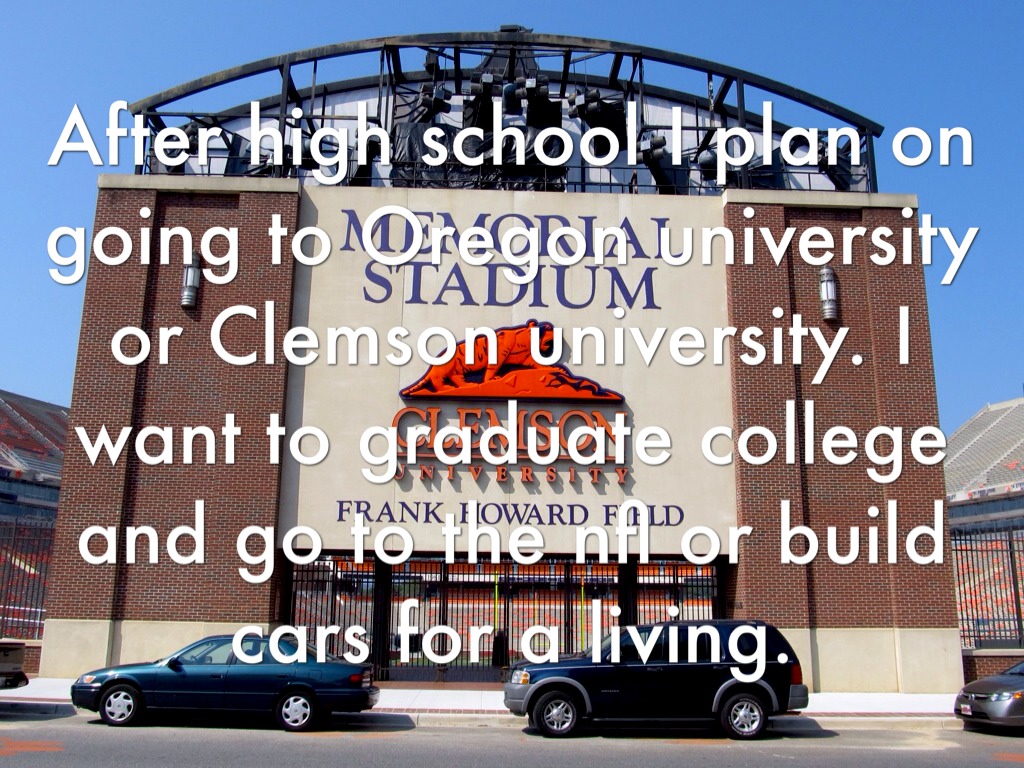After high school I plan on going to Oregon university or Clemson university. I want to graduate college and go to the nfl or build cars for a living.