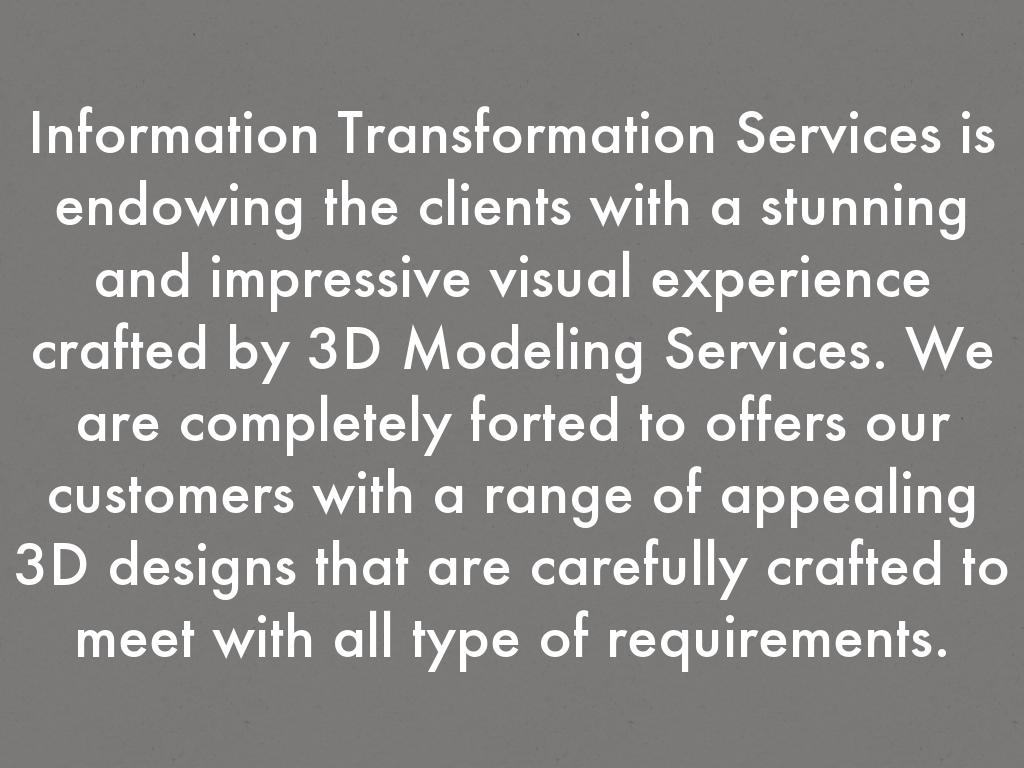 Information Transformation Services is endowing the clients with a stunning and impressive visual experience crafted by 3D Modeling Services. We are completely forted to offers our customers with a range of appealing 3D designs that are carefully crafted to meet with all type of requirements.