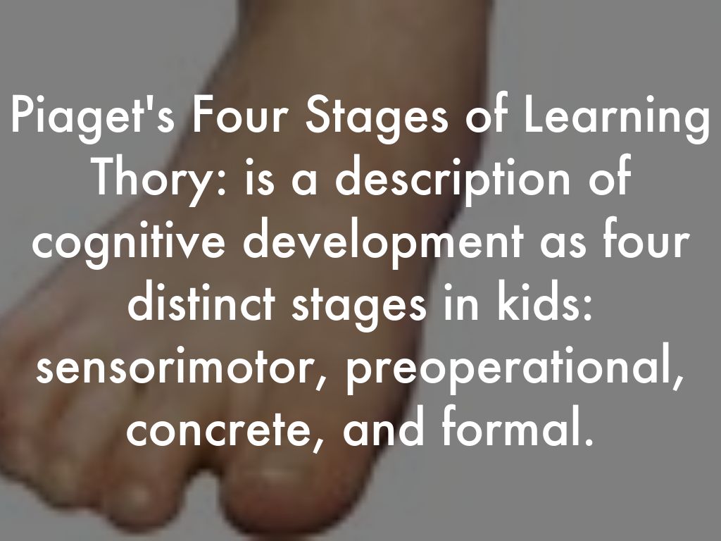 Piaget's Four Stages of Learning Thory: is a description of cognitive development as four distinct stages in kids: sensorimotor, preoperational, concrete, and formal.