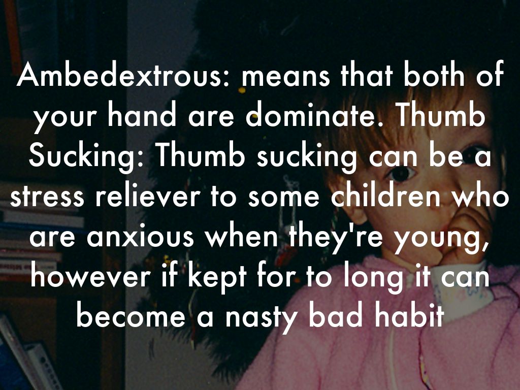 Ambedextrous: means that both of your hand are dominate. Thumb Sucking: Thumb sucking can be a stress reliever to some children who are anxious when they're young, however if kept for to long it can become a nasty bad habit