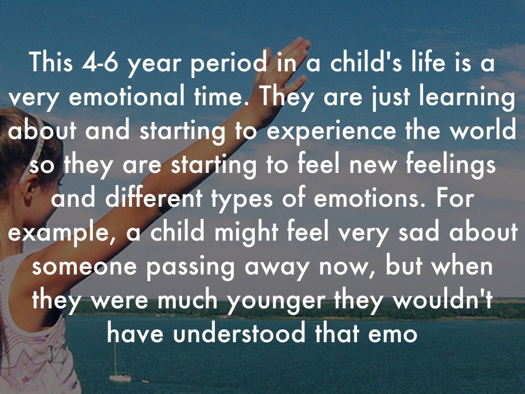 This 4-6 year period in a child's life is a very emotional time. They are just learning about and starting to experience the world so they are starting to feel new feelings and different types of emotions. For example, a child might feel very sad about someone passing away now, but when they were much younger they wouldn't have understood that emo