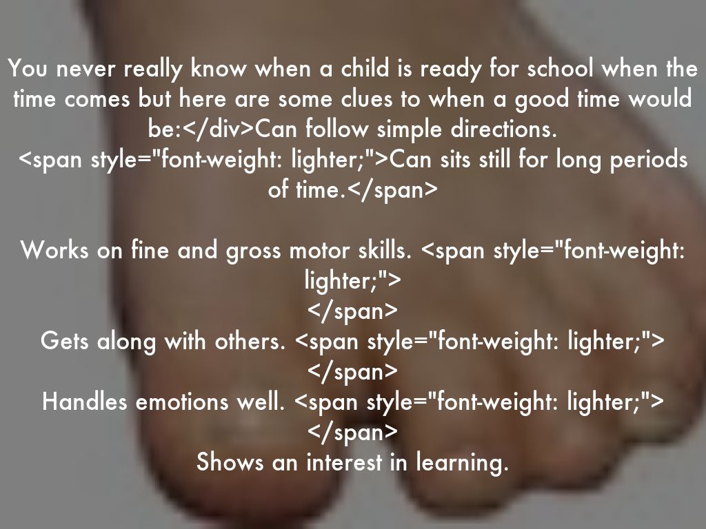 You never really know when a child is ready for school when the time comes but here are some clues to when a good time would be:Can follow simple directions.