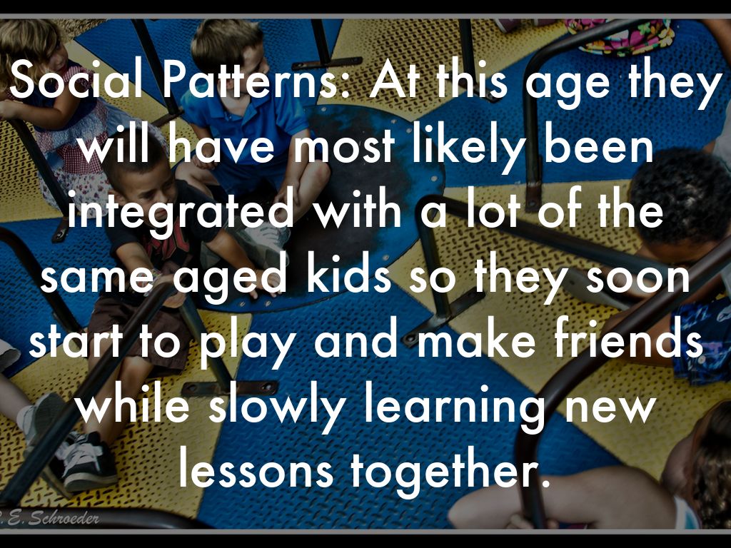 Social Patterns: At this age they will have most likely been integrated with a lot of the same aged kids so they soon start to play and make friends while slowly learning new lessons together.