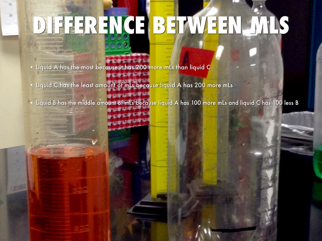 Liquid B has the middle amount of mLs because liquid A has 100 more mLs and liquid C has 100 less B